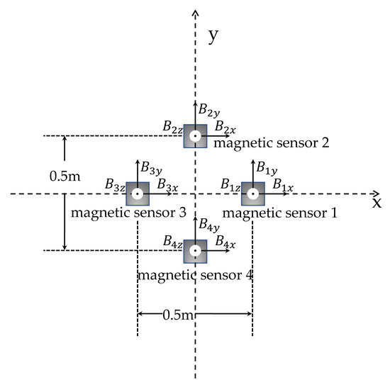 To verify that the condition for the formation of the localization dead zone is the orthogonality between the position vector and the magnetic moment vector, simulations were conducted on the widely-used Nara method [9]. In these simulations, a magnetic dipole was situated at the origin of a spatial Cartesian coordinate system. In this system, the magnetic moment vector of the dipole was defined as Am. The localization results were tested at multiple observation points within a rectangular region situated 3 m above the origin. The coordinates of the four vertices of this rectangle are (−5, −5, 3) m, (−5, 5, 3) m, (5, −5, 3) m, and (5, 5, 3) m. The intervals between observation points in both the x and y directions are 0.02 m. According to Equation (4), to achieve magnetic target localization, it is necessary to measure the magnetic field intensity and MGT. Therefore, the magnetic sensor array structure shown in Figure 3 was employed to measure these two quantities.