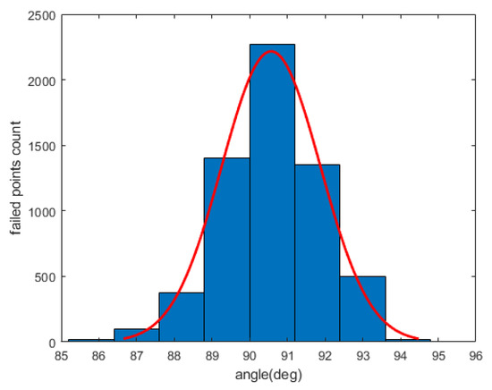 All observation points with a localization error greater than 2 m were extracted. Subsequently, the angles between the magnetic moment vectors and position vectors at these points were computed. A histogram was then created for these angles, followed by a normal distribution fitting, with the results displayed in the Figure 5.