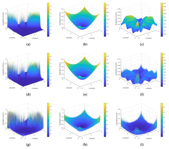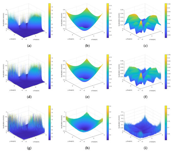 Localization errors of the three methods under different magnetic field noises. (a) Nara method under 0.01 nT geomagnetic field noise. (b) Pei method under 0.01 nT geomagnetic field noise. (c) Proposed method under 0.01 nT geomagnetic field noise. (d) Nara method under 0.1 nT geomagnetic field noise. (e) Pei method under 0.1 nT geomagnetic field noise. (f) Proposed method under 0.1 nT geomagnetic field noise. (g) Nara method under 1 nT geomagnetic field noise. (h) Pei method under 1 nT geomagnetic field noise. (i) Proposed method under 1 nT geomagnetic field noise.