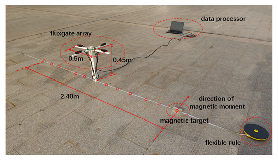 To validate the efficacy of the proposed method, a field experiment was performed in an area characterized by a relatively stable magnetic field. As shown in Figure 9, the MGT measurement system comprises three main components: a magnetic target, a planar cross-shaped MGT measurement array, and a data processor. The magnetic target is a neodymium magnet, emitting a magnetic field intensity of approximately 2500 Gauss. The direction of the magnetic moment is also illustrated in Figure 9. The planar cross-shaped MGT measurement array consists of four triaxial fluxgate magnetometers secured to a cross-shaped bracket. This bracket stands 0.45 m high, with each magnetometer positioned 0.25 m from the bracket’s center. The data processor’s role is to capture the magnetic data and implement the localization method.