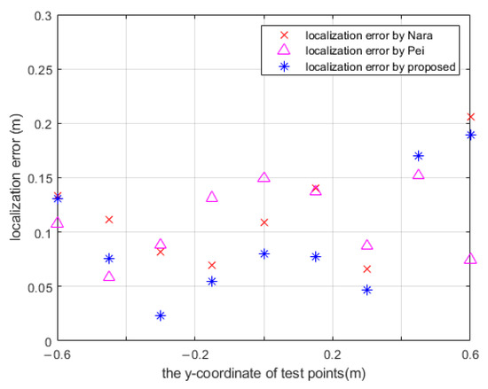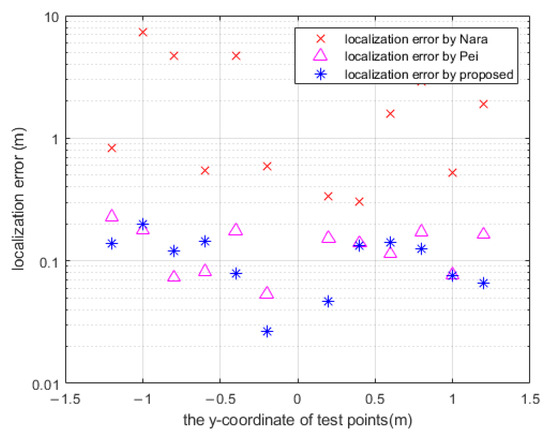 The results of different localization methods are displayed in Figure 10, while Figure 11 presents the corresponding localization errors. In Figure 10, the actual test points and the localization points calculated by the three methods are indicated using different markers. Since the test points are all located within the dead zone, the localization points from the Nara method are significantly distant from the test points, while those from the Pei method and the proposed method are close to the test points. Figure 11 provides a more detailed depiction of the localization errors of these three methods. For comparison, the y axis is represented in logarithmic scale. The localization error of the proposed method is noticeably superior to the Pei method when the magnetic target is close to the MGT measurement device, but at a slightly greater distance, the localization errors of the two methods are almost the same level.