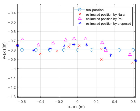 To assess the precision of the proposed localization method under more diverse conditions, a line was established to ensure that the position vector and the magnetic moment vector were not orthogonal. The coordinates of this measurement line’s endpoints were set at m and m, respectively. A total of 9 test points were set along this line, spaced at 0.15 m intervals.
