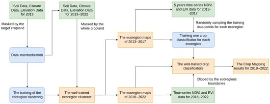 The system architecture comprises a dynamic ecoregion clustering method and a specific crop classifier for each ecoregion. Inputs to the system are represented by green blocks, system outputs are represented by orange blocks, and system processes are depicted in blue blocks.