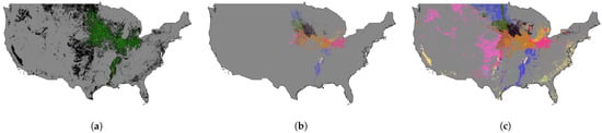 The ecoregion map with 10 clusters of 2013 for soybean mapping. (a) shows the soybean cropland region filtered out by the CDL cultivated layer of 2013, where the green color represents the soybean cropland, and the black color represents the non-soybean cropland. (b) displays the ecoregion map of the soybean cropland region, where each color represents a specific ecoregion. (c) shows the ecoregion map of the entire cropland region, where each color represents a specific ecoregion.