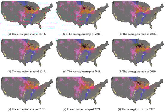The dynamic ecoregions maps with 10 clusters for 2014–2022.