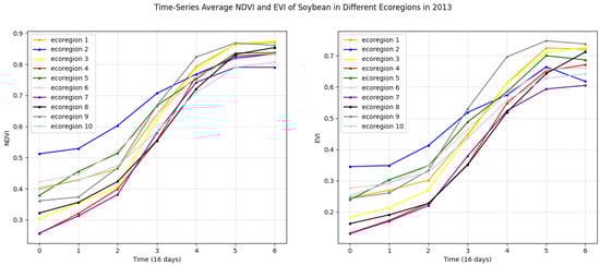 Time-series average NDVI and EVI of soybean in different ecoregions in 2013. Left for NDVI. Right for EVI.