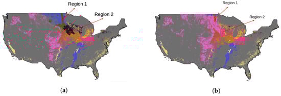 However, these studies were also limited in scope, focusing on counties, states, or groups of states. A crop mapping model that is limited in scope cannot be directly applied to a large-scale setting due to spatial differences. The presence of spatial heterogeneity, encompassing diverse factors like soil types, climate, topography, and other environmental elements, significantly impacts crop growth patterns and diminishes the model’s accuracy outside of its intended region. Overcoming this challenge necessitates the integration of spatially explicit information into the method, effectively capturing and using the spatial variations and encompassing the diverse conditions present across the target area. There are some works [16,17], that use Growing-degree-day (GDD), which is a valuable metric that quantifies the accumulated heat necessary for the growth and development of vegetation. Its significance lies in its crop-specific nature, as the magnitude of GDD required during different growing stages varies for each crop. This characteristic makes GDD a valuable tool in crop classification, as it provides insights into the progression and timing of crop growth. By considering the crop-specific GDD thresholds for various stages, it becomes possible to leverage this metric for accurate and effective crop classification and monitoring. Other studies have performed crop classifications at smaller administrative units such as Agriculture Statistics Counties and Districts [24], states [22], or Agroecological zones [18]. Nonetheless, these methodologies either disregard fluctuations in precipitation and soil characteristics or are conducted within administrative or political demarcations that lack relevance to crop phenology. Alternatively, they encompass areas of such magnitude that they fail to encompass the nuanced phenological fluctuations driven by climatic variations.