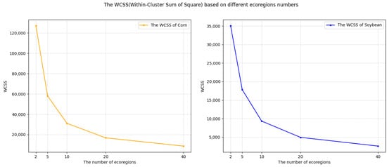Within-cluster sum of squares (WCSS) of the environmental dissimilarity based on the pro-processed environmental data for different numbers of ecoregions in the corn cropland region (left) and soybean cropland region (right), during ecoregion clustering training in 2013.