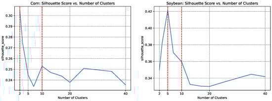 Rather than directly dividing the CONUS into 500 clusters as in [10], we employed both the elbow method and silhouette method to determine the optimal number of clusters for our approach. This allowed us to balance cluster granularity with computational efficiency, ensuring both accuracy and practicality. Specifically, we calculated the environmental dissimilarities for different cluster numbers in the training year 2013, as shown in Figure 7 and Figure 8. As depicted in Figure 7, we found that ten clusters were optimal, while the dissimilarity significantly decreased with a noticeable reduction starting at ten clusters for both soybean and corn cropland regions. Further insights gleaned from Figure 8 indicate that, for corn, a configuration of two clusters attains the highest silhouette score, while for soybean, this optimal number becomes to five.