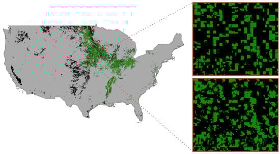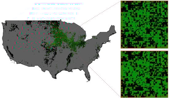Given the successful performance of our soybean mapping approach using ten different ecoregions and computational efficiency considerations, we extend our experiment to map corn crops using the same approach. As shown in Table 6, our dynamic ecoregion-mapping method demonstrates similar levels of Producer’s Accuracy across different years, except for 2021, where we observe a notable improvement from 82.04 to 83.83%, representing a 1.79% increase over the static method. In terms of User’s Accuracy, our dynamic approach outperforms the static method, with the greatest improvement observed in 2019 from 76.62 to 77.72%. Overall, these results demonstrate the effectiveness of our dynamic ecoregion-mapping approach for mapping corn crops, with improvements in both Producer’s Accuracy and User’s Accuracy compared to the static method. Similar to the soybean mapping result, Figure 11 presents our corn-mapping results for the CONUS in 2021.