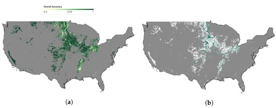 In our investigations, we observe that our dynamic ecoregion method, employing two, five, and ten distinct ecoregions, typically outperforms the static ecoregion method across most years in early soybean mapping. Particularly, the ecoregion configuration with ten divisions yields the most accurate outcomes. However, an interesting anomaly arises in the year 2020, where the static ecoregion map exhibits superior User’s Accuracy performance. This divergence implies that the static ecoregion map could possess advantages in specific scenarios, although overall, our dynamic ecoregion method generally exhibits enhanced accuracy. Notably, a comparison of pixel-wise overall accuracy between the dynamic and static methods for the soybean mapping underscores that the dynamic approach significantly outperforms the static approach in regions where shifts in ecoregion types between 2013 and 2021 have occurred. This contrast is particularly evident in the northern CONUS, confirming the enhanced robustness of our method against climate fluctuations between different years.