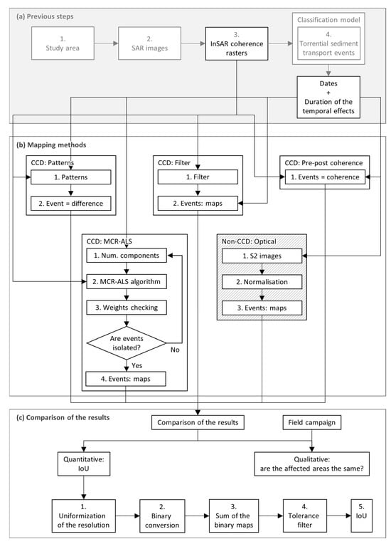 The mapping of the area affected by a torrential sediment transport event using CCD requires us to first (i) define the study area, (ii) download the SAR images of the study period (Table A1), (iii) calculate the rasters of InSAR coherence (Equation (1)), and (iv) identify the events that occurred during the study period, i.e., the dates when such events happened and the duration of the temporal soil moisture decorrelation. These steps were already carried out in a previous work [27], and the results are used here as a starting point, i.e., input data (Figure 3a). Then, with the rasters of coherence, the dates of the events, and the duration of the temporal effects related to each event, i.e., the soil moisture decorrelation, the procedure is different for each method (Figure 3):