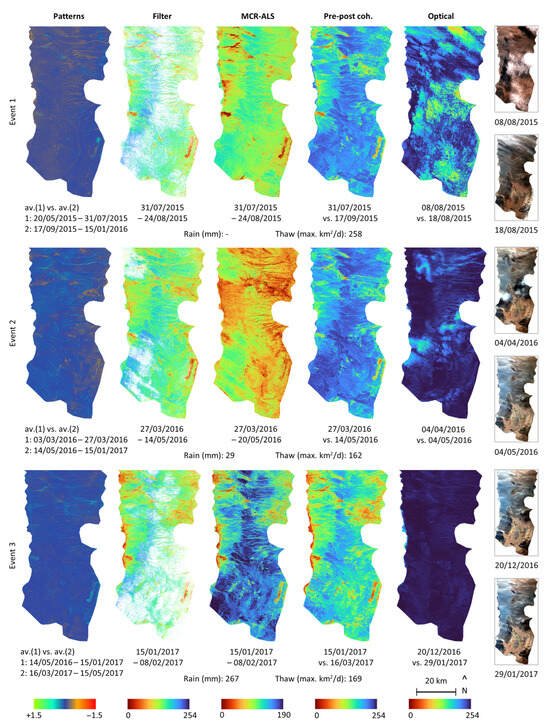 Note that the methods based on the coherence between consecutive SAR images (namely, patterns, filter, and MCR-ALS) are applied to the whole series of rasters, including events and “non-events”. Nevertheless, the previous analysis to identify the occurrence of the events and the duration of the temporal disturbances in the InSAR coherence is necessary as it provides the required input information. The pre–post coherence and the optical methods greatly benefit from such an analysis since it allows us to only work with the relevant dates.