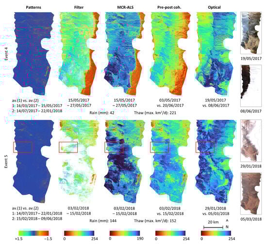 Results (i): events 1 to 3. Comparison between the different mapping methods (columns) for each torrential sediment transport event that occurred during the study period (rows). The rightmost images are the pairs of optical images compared for each event, included in this figure to ease the interpretation of the changes mapped with them. The dates of the time periods covered by each map are indicated below, as well as the rainfall accumulated during that event at the meteorological station in the Salar de Atacama Basin that registered the largest amount, and the maximal daily decrease in the snow cover in the study area during the event (thaw). Note that, although the colour legend is not the same for every method, their meaning remains the same (except for the patterns method): red indicates changes, while blue indicates stability. For the patterns method, the brightest colours indicate changes, while the darkest (blue) colours indicate stability. There is a general agreement in the detection of the areas affected by torrential sediment transport between the CCD methods, except for the MCR-ALS map of event 2. According to the meteorological records, this may be due to aeolian sediment transport.