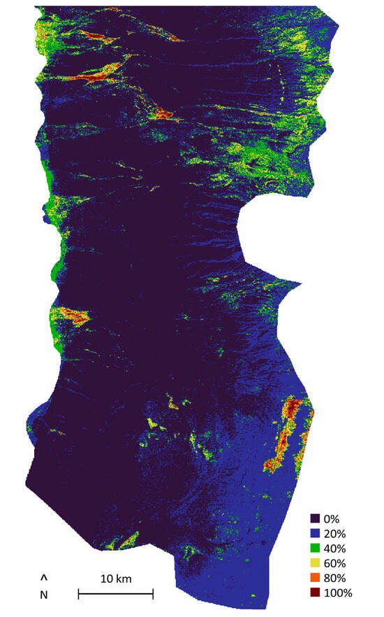 The topography of the study area is characterised by the great altitudinal gradient, the hydrographic network, and the surficial geology (Figure 1d). The latter can be summarised as pre-Quaternary outcrops between the Quaternary volcanic outcrops of the eastern summits and the alluvial fans at the western bottom, with several Quaternary pyroclastic and colluvial deposits on top that are more frequent in the sub-basin of Talabre. Thus, the topographic slope progresses from extremely steep slopes at the eastern summits (>30°) to the flat alluvial fans at the bottom (0–5°) and the nucleus to the west (0°). In between, moderate slopes of 0–10° are found, except in the most prominent outcrops (10–30°) and the steep banks of the gullies (>30°) (Figure 1e).