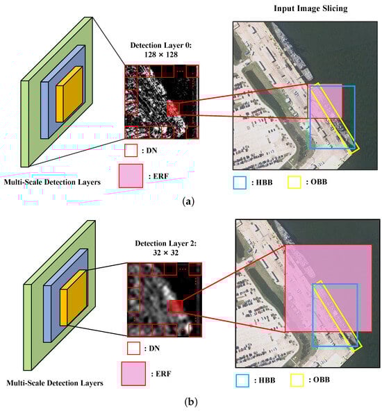 Take the classic anchor-based object detector as an example, as shown in Figure 1, at each position of the multi-scale detection layers, a certain number of anchors will be preset for overlap calculation with GT (ground truth). When an anchor and GT meet certain position and overlap conditions (i.e., label assignment strategy), it will be determined as positive or negative. However, no matter whether HBB (horizontal bounding box) or OBB (oriented bounding box) is used as the labeling of GT, the effective receptive field (ERF) [13] of each DN does not change; that is, no matter what shape and aspect ratio of the object appears at the current position, existing detectors use a fixed feature vector to represent it. This means that for the red high potential DN in shallow feature layers shown in Figure 1a, its feature learning area is limited and does not coincide with the space occupied by the target. This issue has been discussed by some scholars [14,15] and summarized as a feature misalignment problem; however, these researches have not conducted in-depth summary and analysis of internal causes.