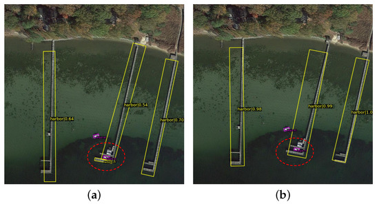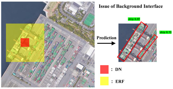 For this issue, one intuitive solution is using multi-scale feature representations to compensate for the uncertainty caused by the change of image and target size. However, another problem arises, as shown in Figure 1b. With the deepening of the network and the down sampling operation, the ERF of DN has expanded. In the detection layer 2 with the size of 32 × 32, the marked DN expands its knowledge learning range but also receives more complex background information. The case in Figure 2 shows the negative impact of the disorderly expansion of ERF, which occurs in a real application scenario. Because the containers and cargo ships in the port have very similar characteristics, they are easily confused when they appear in the ERF of the same DN. Therefore, the container on the shore is also mistakenly identified as a ship with a high confidence. To deal with those problems, an ideal situation is that the field of vision focused by each DN is the whole body of the target, and does not contain additional background. However, due to the randomness of target size and input image size, it is difficult to achieve the above situation. More importantly, through the above case study, we observed that multi-scale feature fusion and feature extraction units are mutually constrained and auxiliary, because they jointly affect the ERF of each DN.