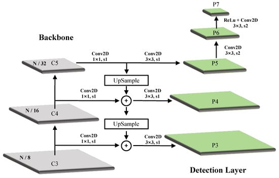 It can be seen in Figure 4, RetinaNet-R employs the , , in the backbone network as the foundation for the following feature fusions. , , and are performed by 1 × 1 convolution to obtain the same channel dimension (256 in the baseline). Then, is obtained through a convolution layer of 3 × 3. The top-level feature is transmitted in a top-down manner and fused with low-level features layer by layer to obtain and . In this way, layer () is the same size as layer . Based on , is obtained through a 3 × 3 convolution with stride set to 2. is obtained through a Relu activation function and a 3 × 3 convolution with stride set to 2.