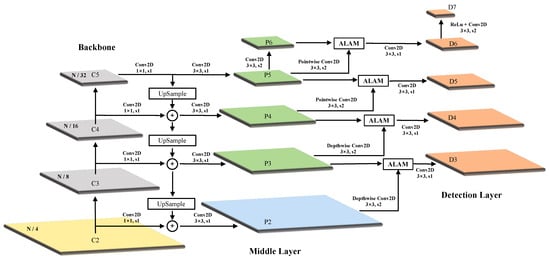 Figure 5. Structure of FG-FPN. Conv2D 1 × 1, s1 refers to 1 × 1 convolution with stride set to 1. N denotes input image size. N/4 denotes the feature map resolution. ⊕ means addition. ALAM refers to arhat layer attention module. - (2):
