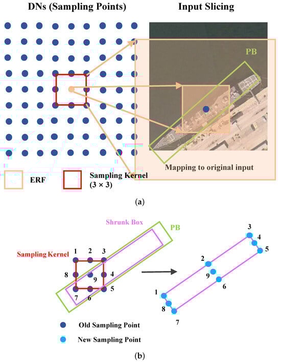Taking the convolution of as an example, sampling offsets in both directions (18 values) are claimed at each point, making it possible to expand the ERF of DNs by providing learning capabilities in the sampling process. However, when applying DCN in AOOD, due to the larger object ratios and random orientations, intelligent ERF transformation faces challenges. As shown in Figure 8a, since PB is derived by OBB-guided regression, it basically fits the contour of the target. However, we hope that our sampling points (dark blue points in Figure 8a) can evenly fall on the target body, rather than just be limited to a certain part of the target (ERF box with mapping to original input in Figure 8a) or the boundary of the target. Alignment convolution in [14] ignores the solution to this problem. In our experiments, we try our best to place each sampling point on the main body of the object, as this ensures that the learned knowledge is focused on the object itself rather than the background features. Hence, we have designed a sample point reassignment strategy, as shown in Figure 8b. We use a shrunk PB to constrain the sampling position, making the sampling point better located inside the rotated bounding box.