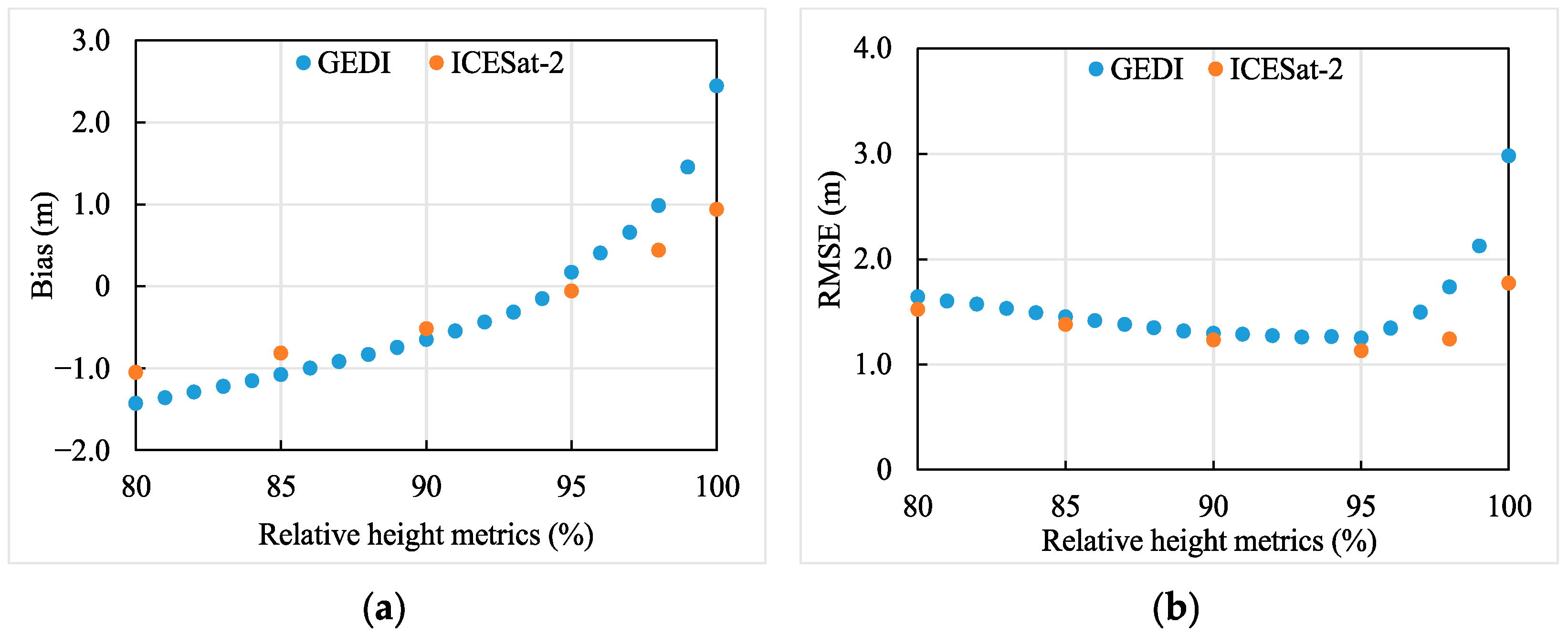 - Wang, C.; Elmore, A.J.; Numata, I.; Cochrane, M.A.; Lei, S.; Huang, J.; Zhao, Y.; Li, Y. Factors affecting relative height and ground elevation estimations of GEDI among forest types across the conterminous USA. GISci. Remote Sens. 2022, 59, 975–999. [Google Scholar] [CrossRef]