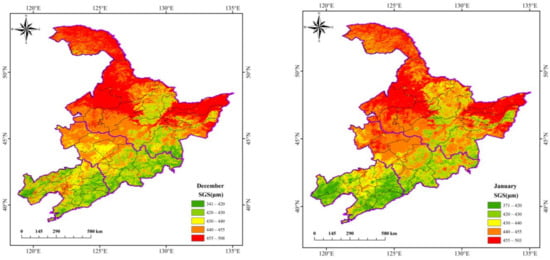 The spatial distribution of SGS in December, January and February of each year from 2000 to 2019 was superimposed and averaged to obtain the spatial distribution of SGS in northeast China in December, January and February from 2001 to 2019 (Figure 13). The spatial distribution of SGS in December, January and February in northeast China from 2001 to 2019 is characterised by being high in the north and low in the south, with three high centres of SGS in each month of winter in northeast China, namely the Daxinganling region, the northern part of Qiqihar, the southern part of Heihe and the Hegang and Jiamusi regions. All three high-value centres were present in December and January, with an SGS above 455 μm in the high-value centres. The range of the SGS sub-maximum centres (440–455 μm) in the areas of Songyuan, Changchun and Siping was extended in January. By February, there was an overall reduction in SGS. The range of high-value centres in the northern Qiqihar and southern Heihe regions continues to shrink in the north, and the range of high-value areas in the Daxinganling region is sharply reduced to a scattered distribution. Yichun, Baishan, Tonghua, Fushun, Benxi, Dandong, Huludao, Chaoyang, Fuxin and Dalian are always low-value areas, with a SGS always below 430 μm.