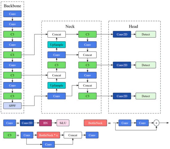 The YOLOv5 model consists of three primary components: the Backbone, Neck, and Head modules. The Backbone network is responsible for extracting feature information from input images, while the Neck module aggregates these features to generate three feature maps at different scales. Upon these features, the Head module performs object detection. The YOLOv5 model primarily adopts the CSPDarkNet53 structure, utilizing the Convolutional (Conv) layer, C3 layer, and SPPF layer in the backbone network. The Conv layer comprises convolution, batch normalization, and the SiLU function. By employing residual connections, the C3 module effectively reduces model parameters, thereby improving the inference speed. SPPF, an improved version of the original SPP module, replaces the max-pooling layers of size 5 × 5, 9 × 9, and 13 × 13 with three max-pooling layers of size 5 × 5. This modification ensures the fusion of features with different receptive fields while further enhancing operational speed. In terms of the Neck component, YOLOv5 incorporates the Path Aggregation Network (PANet), which extends upon the Feature Pyramid Network (FPN) by introducing bottom-up pathways. After top-down feature fusion in FPN, the bottom-up pathways transmit positional information from lower levels to deeper ones, significantly enhancing localization ability across multiple scales. YOLOv5 includes five derivative models: YOLOv5n, YOLOv5s, YOLOv5m, YOLOv5l, and YOLOv5x. These models share the same architecture but vary in width and depth. For a comprehensive illustration of the original YOLOv5 model’s overall structure, please refer to Figure 1.