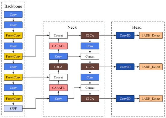 In this section, we will delve into the key enhancements of our innovative approach, which include the integration of the FasterConv module, the LADH-Head module, the C3CA module, and the utilization of the XIoU loss function. Furthermore, Figure 2 illustrates the architectonic rendition of our refined YOLOv5 model.