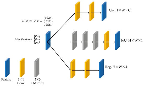By segregating the network based on task types, we utilize three distinct channels to perform the relevant tasks. To expand the receptive field and increase task parameters for the IoU branch, we employ three convolutions that reduce features along the channel dimension. In place of the conventional 3 × 3 convolutions in each branch, we employ 3 × 3 depth-wise separable convolutions (DWConv) as replacements in the ADH network.