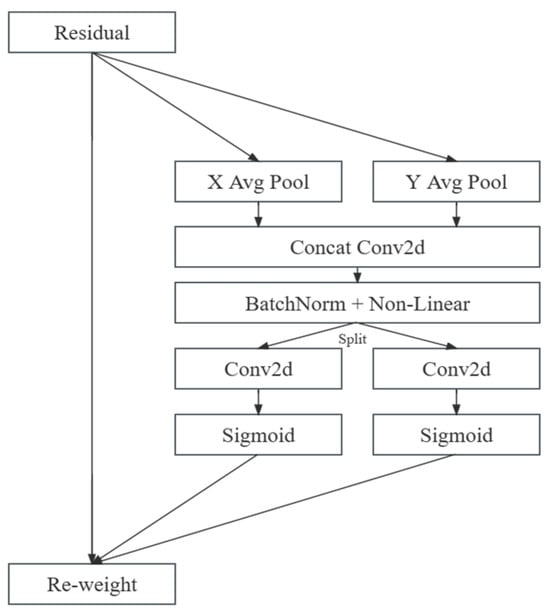 where the [•, •] represents the concatenation operation along the channel dimension. δ denotes the non-linear activation function Hswish, and signifies the intermediate feature mapping of spatial information in both horizontal and vertical directions. Here, is employed to control the scaling ratio of the number of channels. Along the channel dimension, is divided into two separate vectors: and . Through two 1 × 1 convolutions, and are transformed into and , respectively, ensuring they possess the same number of channels as the output X.