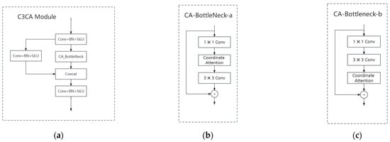 Network architectonic of C3CA module and CA_BottleNeck. (a) represents the C3CA module, (b) represents the conventional method of inserting Bottleneck by the attention mechanism, and (c) represents the embedding approach we adopt.