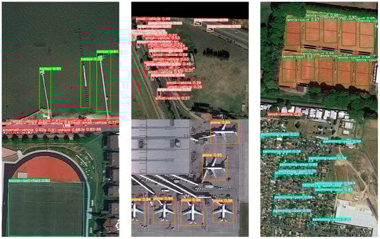 In our experiments, we train the proposed approach using the SGD optimizer with an initial learning rate of 0.01. The DIOR dataset was trained for 300 epochs, while both the DOTA and SIMD datasets underwent 150 epochs of training, utilizing a batch size of eight. To effectively optimize the model’s learning rate, the first three epochs were dedicated to warm-up training. During this initial phase, the learning rate was set at 0.1 and subsequently reduced to 0.01 for the remaining training process. The DIOR dataset employed images with dimensions of 800 × 800, while the DOTA and SIMD datasets enlarged the image size to 640 × 640. We set the momentum to 0.937 and used a weight decay coefficient of 5e-4. All other parameters remained consistent with the original YOLOv5 configuration. We applied the same parameter settings across all experiments involving alternative methods.