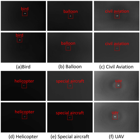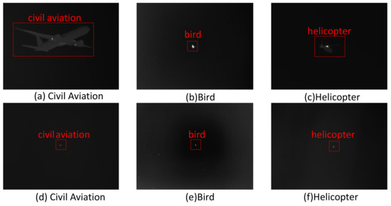 To classify a high-altitude flying object, we employed a long-wave infrared camera to capture video images. The results are displayed in Figure 3 below, with a and d representing civil aviation, b and e depicting birds, and c and f portraying helicopters. From the figure, it is evident that, as the high-altitude flying object moves further away from the camera, there is a drastic decrease in pixel count and a gradual blurring of their shapes, making it challenging to discern their contours clearly. Particularly in the images of e and f, the targets appear as bright spots. Therefore, the classification of a high-altitude flying object based solely on visual information poses an extremely challenging task.