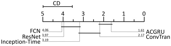 To further explore the differences between specific algorithms, we conducted the Nemenyi post hoc test. Based on Table 9, the value of is 2.728, which means that CD is equal to , with a value of 1.44. Therefore, ACGRU performs significantly better than Inception-Time (3.19 − 1.61 = 1.58 > 1.44), FCN (4.06 − 1.61 = 2.45 > 1.44), and ResNet (3.97 − 1.61 = 2.36 > 1.44). There is no significant difference between ACGRU and ConvTran (2.17 − 1.61 = 0.56 < 1.44). The significance differences between each classifier are shown in Figure 8, with the average rankings of each algorithm across all datasets plotted on the x axis.