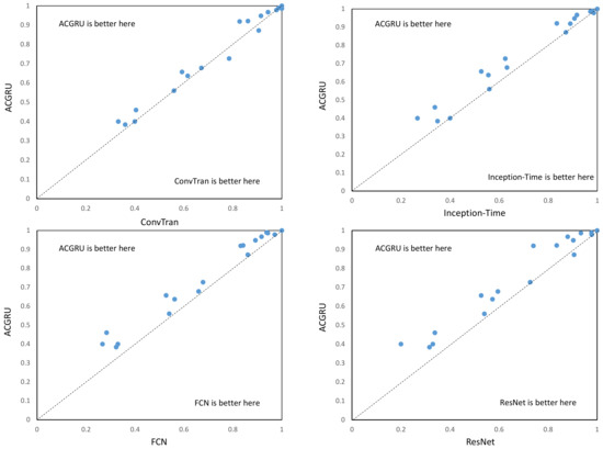 Based on the results of the significance analysis, we plotted the ACGRU algorithm separately with four other algorithms to further analyze the differences between ACGRU and these algorithms. The scatter plot shown in Figure 9 represents the accuracy of each classifier on the shared dataset, with each data point representing the accuracy difference between two classifiers. The larger the distance from the diagonal line, the greater the difference in accuracy between the two classifiers. Data points above the diagonal line indicate that the ACGRU algorithm outperforms the other models in terms of accuracy, while data points below the diagonal line indicate that the ACGRU algorithm is not as accurate as the other models. Although there is no significant difference between ACGRU and ConvTran, since ConvTran adopts Transformer technology that is fundamentally different from CNN and RNN, and Transformer is considered an advanced algorithm for processing sequential data, we consider the significant detection results between ACGRU and ConvTran to be acceptable. By observing Figure 8, we found that, for certain specific tasks, the accuracy of ACGRU is higher than that of ConvTran, especially for our high-altitude flying object classification task, where the accuracy of ACGRU is 3.3% higher than that of ConvTran. Thus, for the field of spatial governance, the ACGRU algorithm seems to be the more reasonable choice. On the other hand, ConvTran performs better than ACGRU in tasks with a smaller sample size and a longer-term dependency. From Figure 9, we can see that, for the majority of the datasets, ACGRU outperforms Inception-Time, FCN, and ResNet algorithms, indicating that ACGRU has a clear advantage over them.