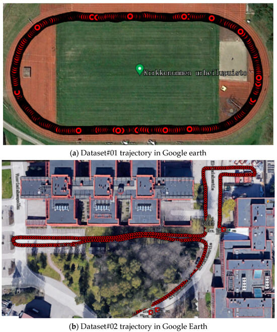 Initially, tests were carried out in an open-sky sports track where the available satellites provided an ideal scenario; as depicted in Figure 3a, the reference trajectory of the collected dataset is shown. In this setting, there were no tall buildings or obstructions affecting GNSS signal propagation. Consequently, GNSS signals and their distribution were anticipated to be ideal for generating reliable position information. Subsequently, datasets were collected in a typical urban environment, as illustrated in Figure 3b in Google Earth. Notably, there were tall buildings and dense forests lining the narrow roads, which could potentially introduce GNSS measurement outliers due to signal reflection from the tall buildings and signal degradation from the surrounding forest.