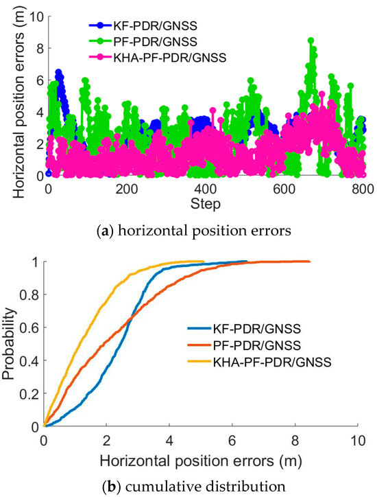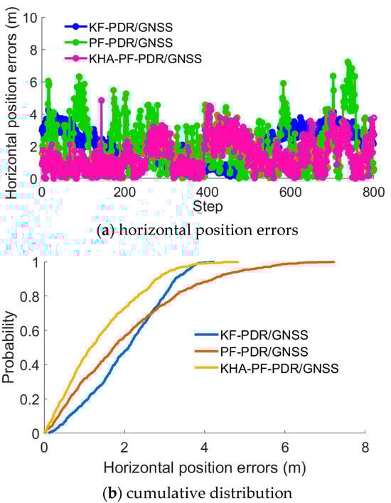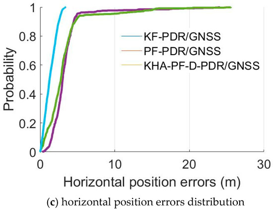 The results of the statistical analysis of the horizontal position errors are listed in Table 1 and Table 2. The mean values and the median values of the horizontal position errors are presented. It can be observed that KHA-PF performs the best. Specifically, for Dataset#01, the KHA-PF mean position errors decreased by 39.6% compared with KF-PDR/GNSS, and the median values of the horizontal position errors decreased by 39.5%; for Dataset#02, the KHA-PF mean and median horizontal position errors improved by 31.5% and 32.8%. Furthermore. Figure 3b and Figure 4b show the horizontal position errors distribution, which also support the conclusion that KHA-PF had the better performance. Basically, the horizontal position results show that the KHA method is effective for optimizing the particle distribution in the PF, which contributes to better position results.