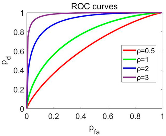 Substituting the defined threshold in Equation (39) with Equation (38), the relationship between the detection probability and false alarm probability is expressed as