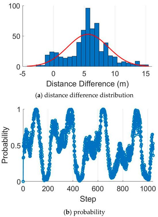 The GNSS and PDR distance difference values distribution is presented in Figure 7; specifically, Figure 7a presents the distance difference distribution from Dataset#01 in the last sub-section, and Figure 7b shows the distance distribution from Dataset#02. A Gaussian model is utilized to fit the distributions, and the red line denotes the fitted Gaussian model probability density curves. It can be observed that the mean values of the fitted Gaussian model are not zero. Ideally, the mean values should be zero. We suggest the following two reasons could account for this: (1) As described in Section 4, we build the probability model assuming the pedestrian is walking straight, and this assumption is not always satisfied. (2) The GNSS measurements contain some errors, even if the datasets are collected in an open-sky environment. Based on the fitted Gaussian model, it is possible to detect the GNSS measurement outliers with the input distance difference measurements. Based on the fitted models, Figure 8 and Figure 9 present the distance difference and the corresponding detection probability results of the two datasets, which shows it is feasible to apply the fitted model to detect the GNSS outliers after properly selecting the detection threshold.