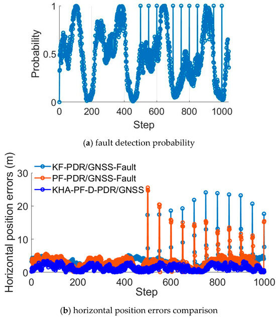 In order to fully assess the performance of the fault detection method, we collected another different sports-track dataset (Dataset#03) with a different person walking to test the proposed method. In Dataset#03, there are about 1000 steps, and we selected the first 300-step dataset to fit the model. Figure 10a presents the distance difference distribution and the fitted model. Figure 10b shows the detection probability according to the distance difference values. Here, we simulated outliers by manually adding bias to the GNSS position measurement. We added a 30 m bias to the GNSS position at the 500, 550, 600, 650, 700, 750, 800, 850, 900, 950 and 1000 epochs. The detection results are presented in Figure 11a, and it can be observed that the outliers are detected with a probability close to 100%. The horizontal position errors from the KF-PDR/GNSS, PF-PDR/GNSS and KHA-PF-D-PDR/GNSS methods are presented in Figure 11b. It can be seen that the GNSS outliers degrade the position results, and the KHA-PF-D-PDR/GNSS with the fault detection module can reduce the negative influence of the GNSS outliers. The statistical analysis results of the horizontal position data from the 301 epochs to the end are listed in Table 3. It can be seen that KHA-PF-D-PDR/GNSS performed the best. In terms of the mean values, the KHA-PF-D-PDR/GNSS mean values decreased by 52.4% compared with the PF-PDR/GNSS without the fault detection module. In addition, the median values also improved: specifically, the median values of the horizontal position errors decreased by 49.6%. Furthermore, Figure 11c presents the horizontal position errors distribution, which also supports the conclusion that the KHA-PF-D-PDR/GNSS method had better performance.