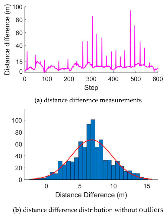 We processed this dataset collected in urban areas in which the GNSS contains outliers. The first 300 step distance difference measurements were fitted to a Gaussian model, and the results were employed to evaluate the performance of the fault detection method. Figure 13a shows the distance difference measurements, and it is obvious that there are many outliers. Here, we set the outliers threshold at 15 m. When the distance difference is larger than 15 meters, the GNSS measurement is regarded as an abnormal measurement. In our strategy, the PDR position substitutes the GNSS/PDR integration results under abnormal GNSS measurement conditions. The Gaussian fitting results based on the distance difference measurements are presented in Figure 13b. When fitting the model with the first 300 step distance difference measurements, we removed the abnormal GNSS measurements according to the pre-defined threshold.