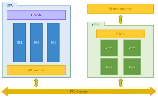 The inference process of the SAR ship target detection task usually runs in a heterogeneous system containing a CPU and a GPU, and its structure is shown in Figure 1. When performing computational tasks, the GPU cannot run alone and usually requires the CPU to assist in running. CPUs usually contain multiple processor cores and caches, each of which can execute one or more threads, and the main advantage of CPUs is that they can handle different types of complex tasks and can better manage and allocate system resources to ensure smooth execution of computational tasks, while GPUs have their own unique streaming multiprocessor (SM) computing architecture and higher bandwidth memory, better suited to handle large amounts of data and parallel computing tasks. The two units are connected via a peripheral component interconnect express (PCI-Express) bus to complement each other and improve the performance and efficiency of the whole system.