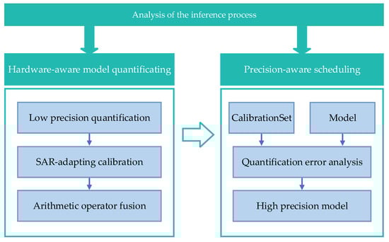 The rest of this study is as follows: Section 2 introduces the steps of a SAR target detection algorithm inference task running on a heterogeneous system including CPU and GPU. Section 3 introduces the SAR-aware model quantification method to reduce the time of inference tasks running on heterogeneous systems. On this basis, a precision-aware scheduling method is proposed according to the GPU computing power characteristics of the heterogeneous system to reduce the precision loss caused by acceleration. In Section 4, we use the method in Section 3 on four different networks to verify the effectiveness of the proposed method. The method used in this paper is compared with TensorRT, the most commonly used GPU acceleration method, and the effectiveness of the proposed method is proved. In Section 5, the experimental results are analyzed and discussed. Finally, the main conclusions are drawn in Section 6.