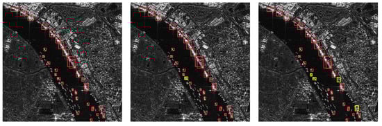 As can be seen from the detection results in Figure 6, the models were detected after quantization using the method proposed in this paper and TensorRT, respectively. In this paper, we are more concerned with the comparison of detection results before and after using the acceleration method. Therefore, we directly used the unoptimized Yolov5 series of networks for SAR ship target detection and there are still some missed detections of ships in baseline. Compared to the detection results of the model without quantization, the detection results of the Yolov5m model after quantization using the proposed method produces two missed targets. The rest of the quantized models have only one missed target. However, the detection results of the models quantized using the TensorRT method all produced more than three missed targets.
