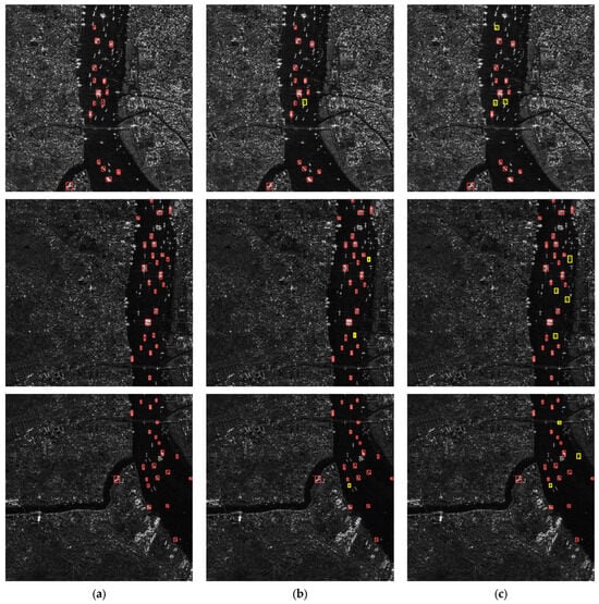 Comparison of detection results. From top to bottom are the results of yolov5n, yolov5s, yolov5m, and yolov5l model detection. Targets marked in red are detected. Targets marked in yellow are missed. (a) Baseline model detection results. (b) Detection results of the model after quantification using the SAMQ method. (c) Detection results of the model after using the PAS method with SAMQ.