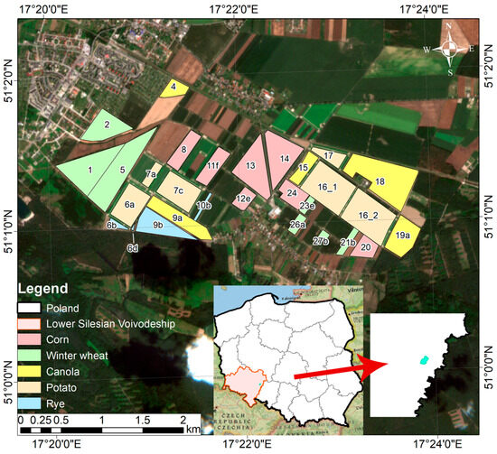 The study area (Figure 1) is situated in an agricultural region between Jelcz-Laskowice, Nowy Dwór, and Piekary villages in the eastern part of Lower Silesia, Poland. A total of 30 agricultural fields were selected for analysis, comprising 7 maize fields, 7 wheat fields, 5 rapeseed fields, 6 potato fields, and 5 rye fields.