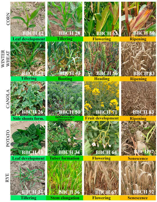 Characteristic appearance of investigated crops in different BBCH scale (Biologische Bundesanstalt, Bundessortenamt, und CHemische Industrie).