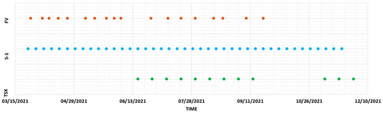 In case of X band data, 12 TerraSAR-X and TanDEM-X images were collected from relative orbit number 17 between the dates of 17 June 2021 and 29 November 2021 in descending geometry to examine the impact of wavelength on the accuracy of crop development tracking. Unlike the Sentinel-1 data, these data were not freely available. Therefore, due to financial constraints, it was impossible to establish a consistent time series. X-band products from Single Look Slant Range Complex (SSC) were used, which have a slightly shorter wavelength than C-band data. They were acquired in Stripmap mode, resulting in the imaging of a consistent strip of terrain with a constant azimuth of the sensor’s antenna pointing and a constant image quality along its motion path. The images in VH and VV polarization, such as the Sentinel-1 data, were used. The characteristics of the utilized data are presented in Table 1 while timeline of the used Sentinel-1 (S-1) and TerraSAR-X (TSX) data but also field investigations (FV) are presented in Figure 3, while.