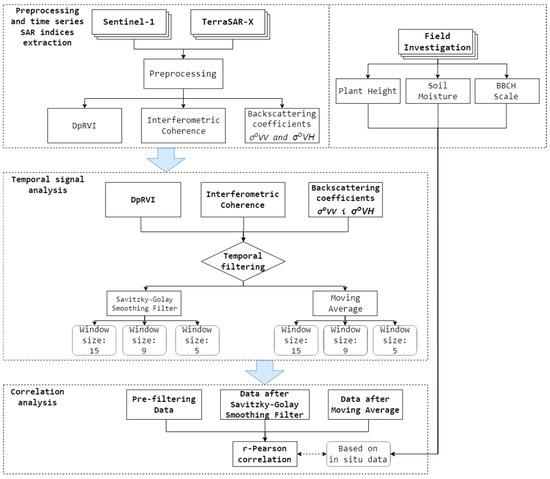 The following subsections represent the corresponding processing steps including in situ data acquisition (Section 2.3.1), Sentinel data processing (Section 2.3.2), TerraSAR-X data processing (Section 2.3.3), temporal filtering (Section 2.3.4), and correlation analysis (Section 2.3.5).