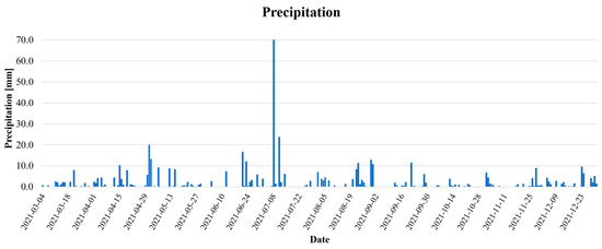 For a better understanding of radar signals, information on daily precipitation totals was collected (Figure 5). The data were recorded by the Wroclaw-Strachowice meteorological station and made available by the Institute of Meteorology and Water Management (https://danepubliczne.imgw.pl/ (accessed on 2 October 2023)).